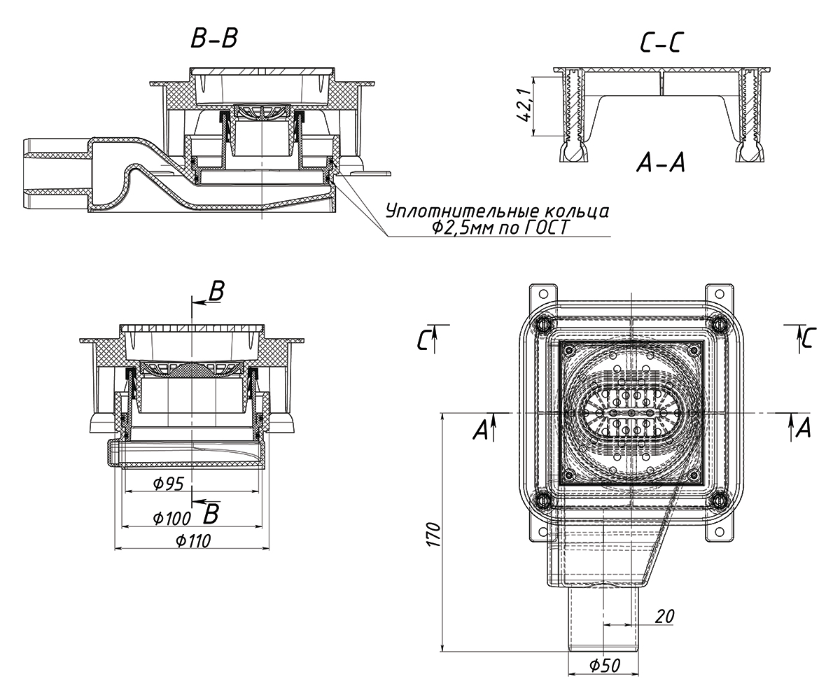 - низкий S-образный сифон с гидрозатвором для предотвращения проникновения запахов из канализации
