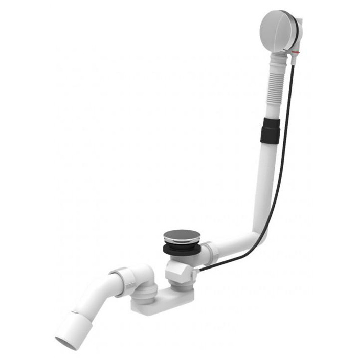 Сифон для ванны автомат Sanit (35.333.000.S000) выполнен из пластика, с тяговым тросиком и вращающейся ручкой с хромированным покрытием, сифоном, отводом Ø 40/50 мм, с гибкой трубой перелива.