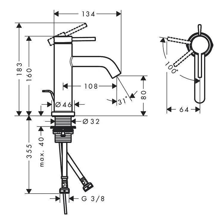 - выступ излива: 108 (134) мм
