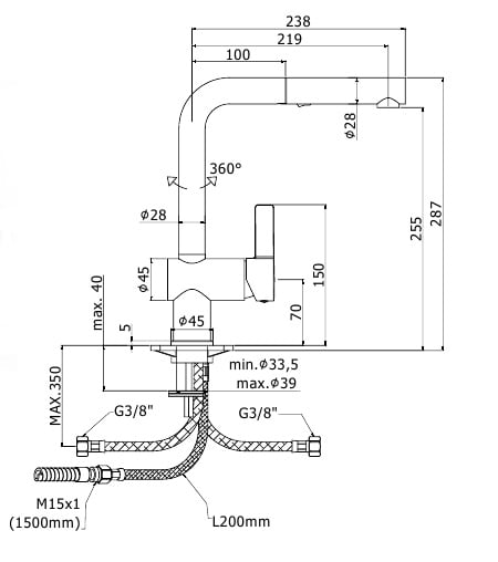 - высота до излива 255 мм