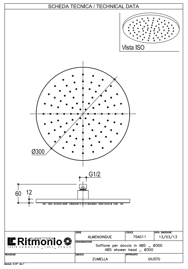 Особенности верхнего душа Ritmonio Soffioni 300 мм (75A011BLX)